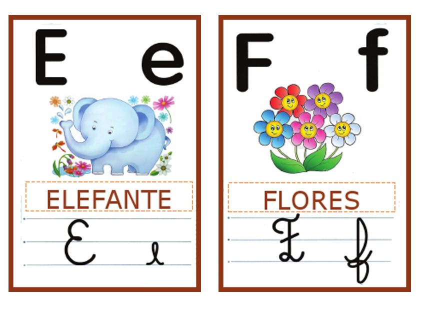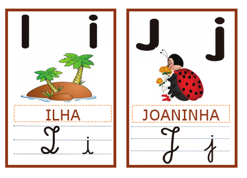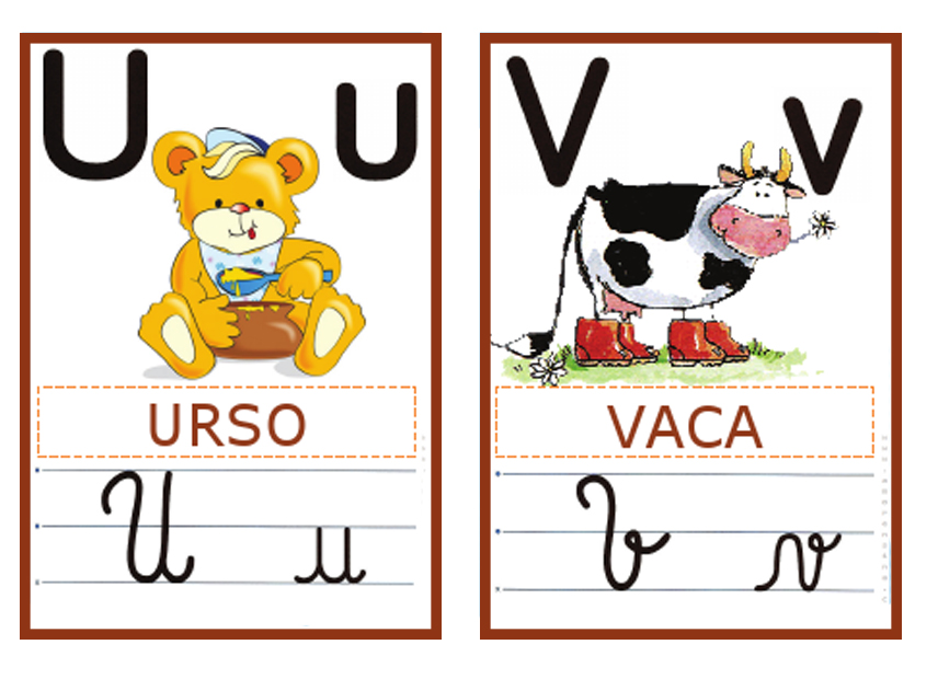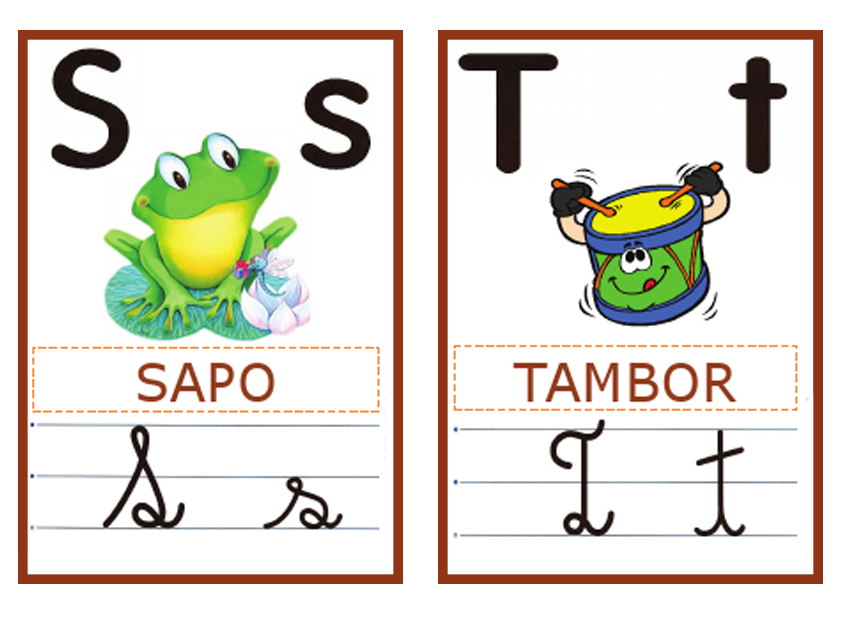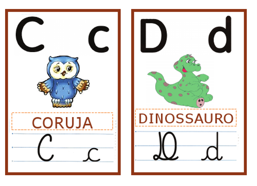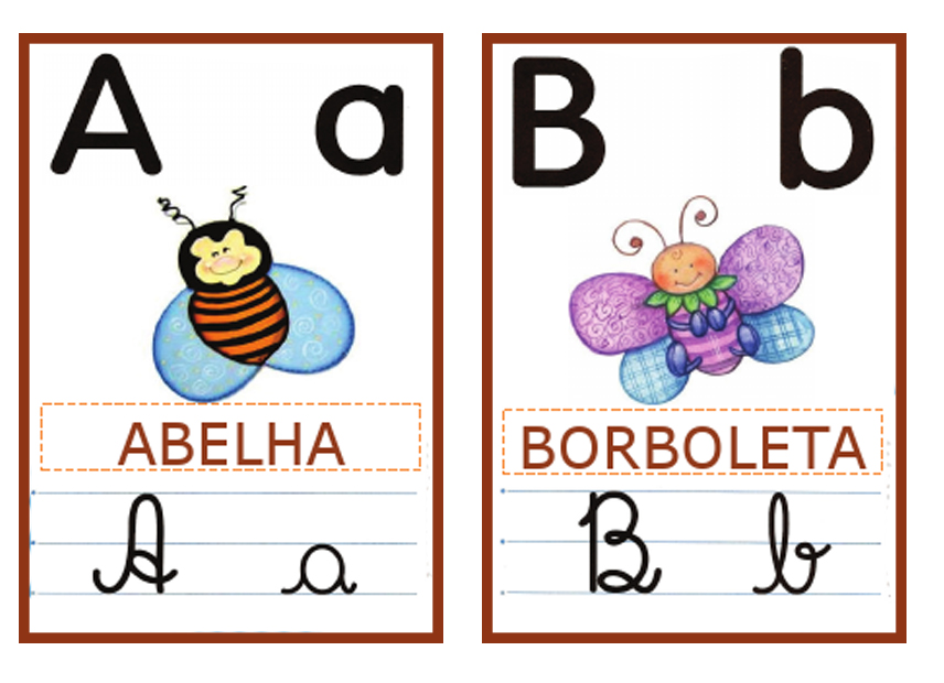 O material é totalmente ilustrativo, com imagens relacionadas a cada letra do alfabeto, acompanhadas do nome do desenho, o que favorece a associação entre letra, som e palavra.