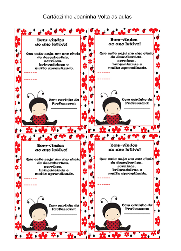 O Cartão para alunos tema Joaninha, da Educação Infantil, é uma lembrancinha encantadora para receber as crianças com carinho no início do ano letivo.