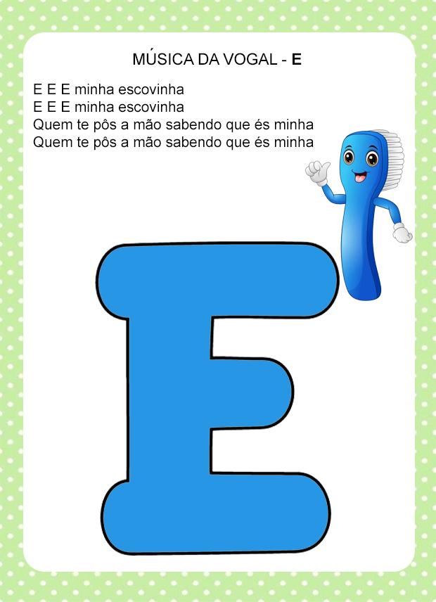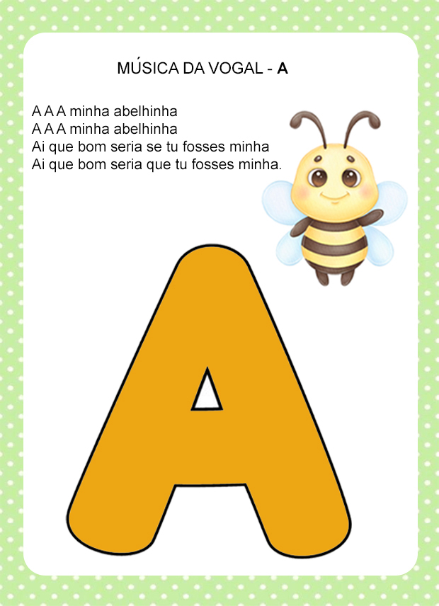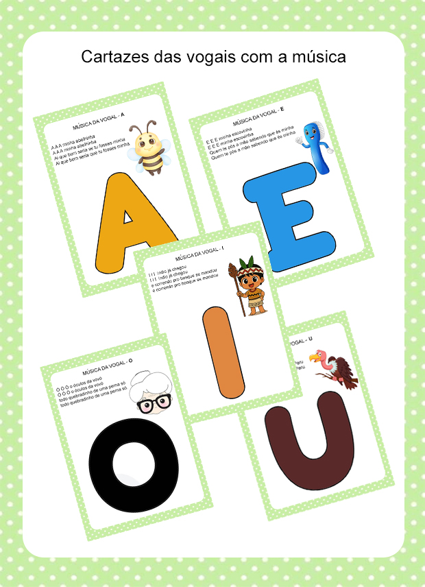 Cada cartaz apresenta uma vogal acompanhada de uma ilustração divertida e uma música relacionada, facilitando a associação entre som, letra e imagem.