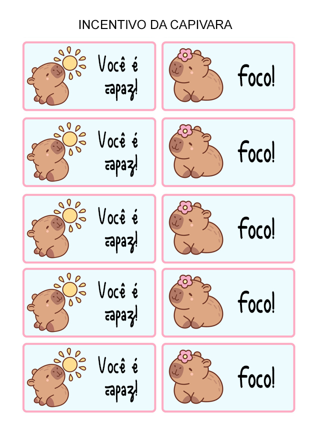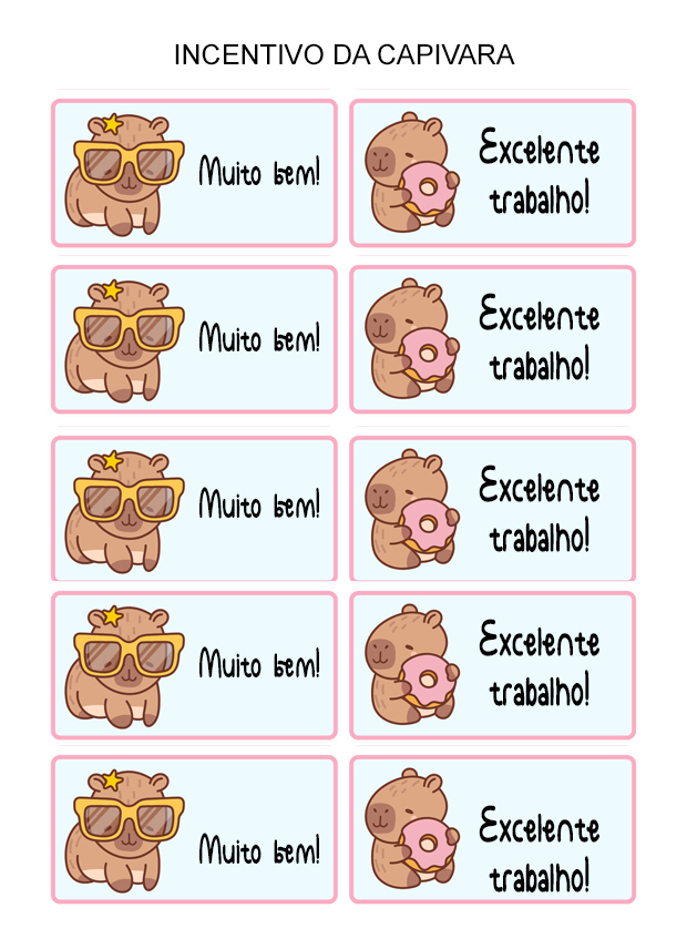 O incentivo escolar com tema de capivara pode ser usado em projetos, murais, agendas ou pastas dos alunos, tornando a rotina mais leve e prazerosa.