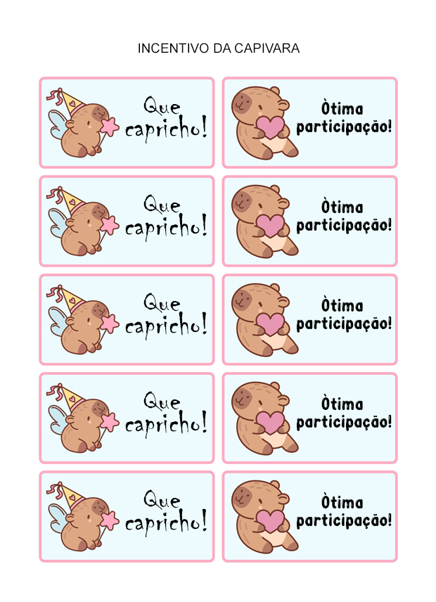 Com ilustrações fofas da capivara, o material pode ser utilizado para reforçar atitudes como participação nas atividades, organização do material, respeito aos colegas e dedicação às tarefas.