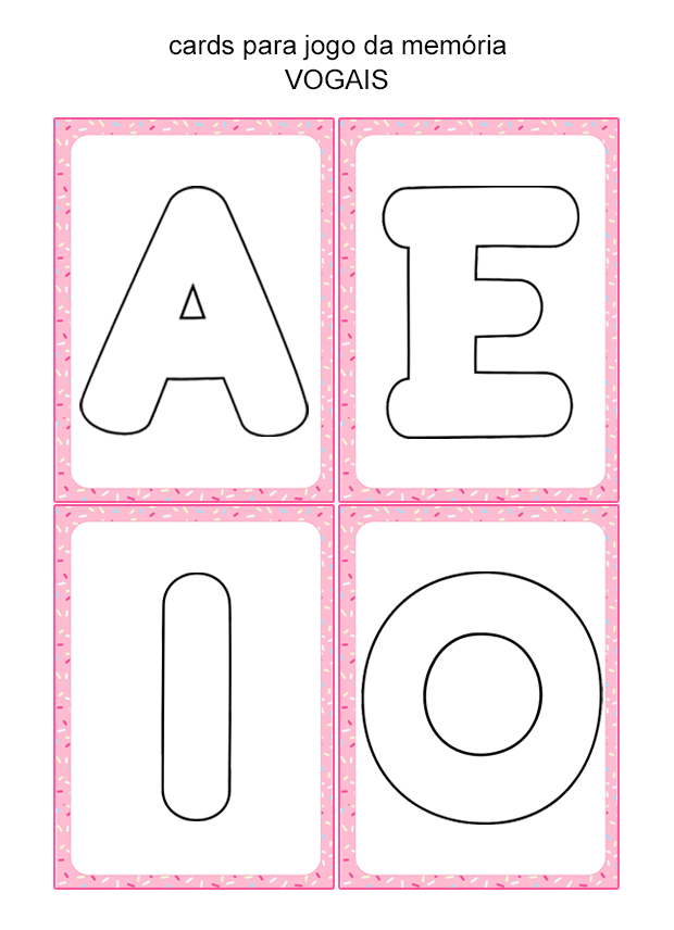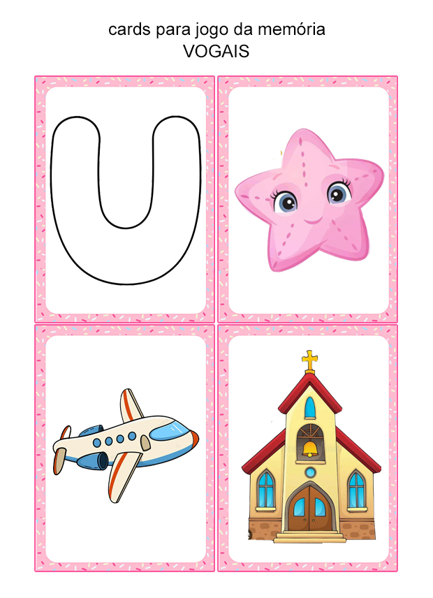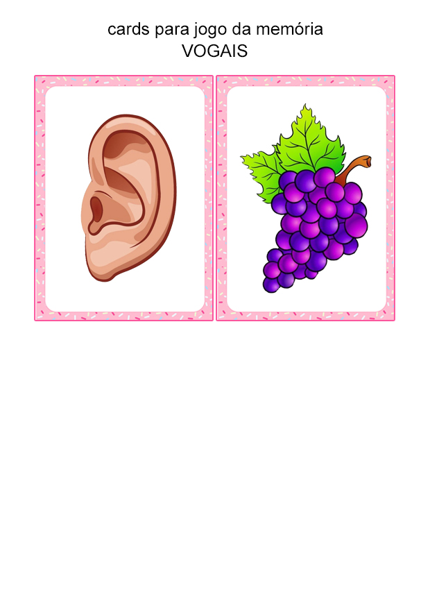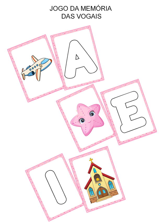 Com cartas coloridas e atrativas, o jogo da memória contribui para ampliar o vocabulário e reforçar o conteúdo das vogais de forma lúdica.