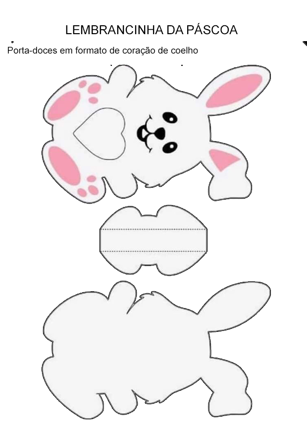 A arte já está pronta e apresenta um coelhinho com um coração na barriga, além das partes da caixinha que devem ser recortadas, coladas e montadas.