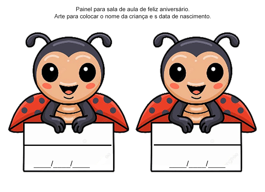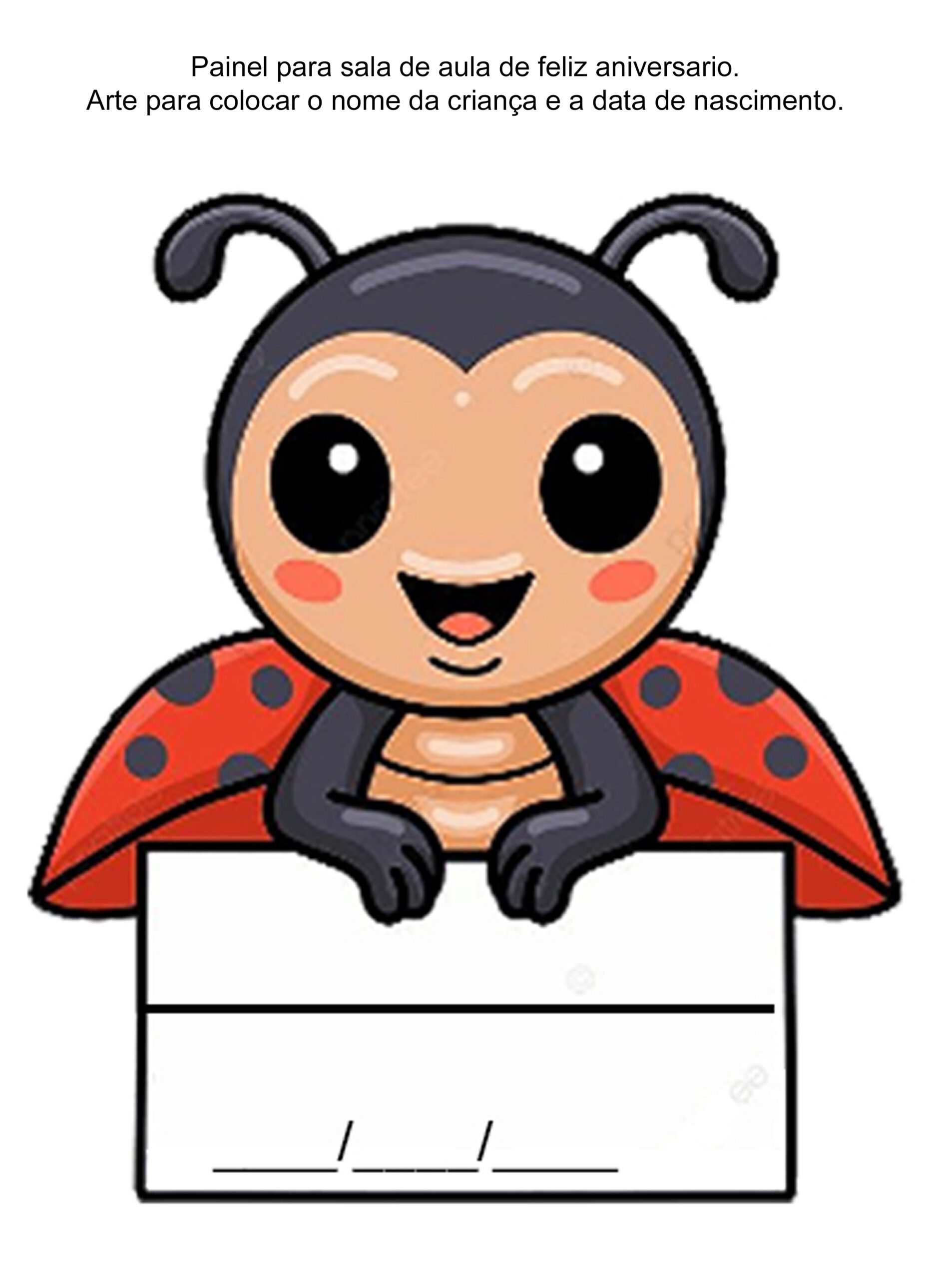 O desenho é uma joaninha segurando uma plaquinha, onde é possível escrever o nome do aniversariante e a data do aniversário.