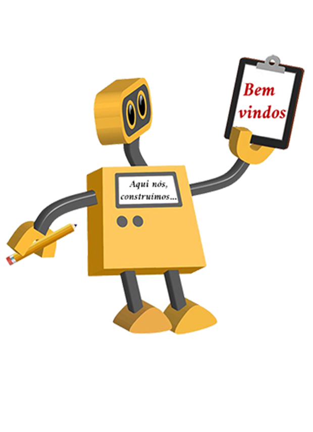 Na barriga do robô, há a frase “Aqui nós construímos…”, acompanhada de cinco chaves e uma porca, representando valores essenciais do ambiente escolar.